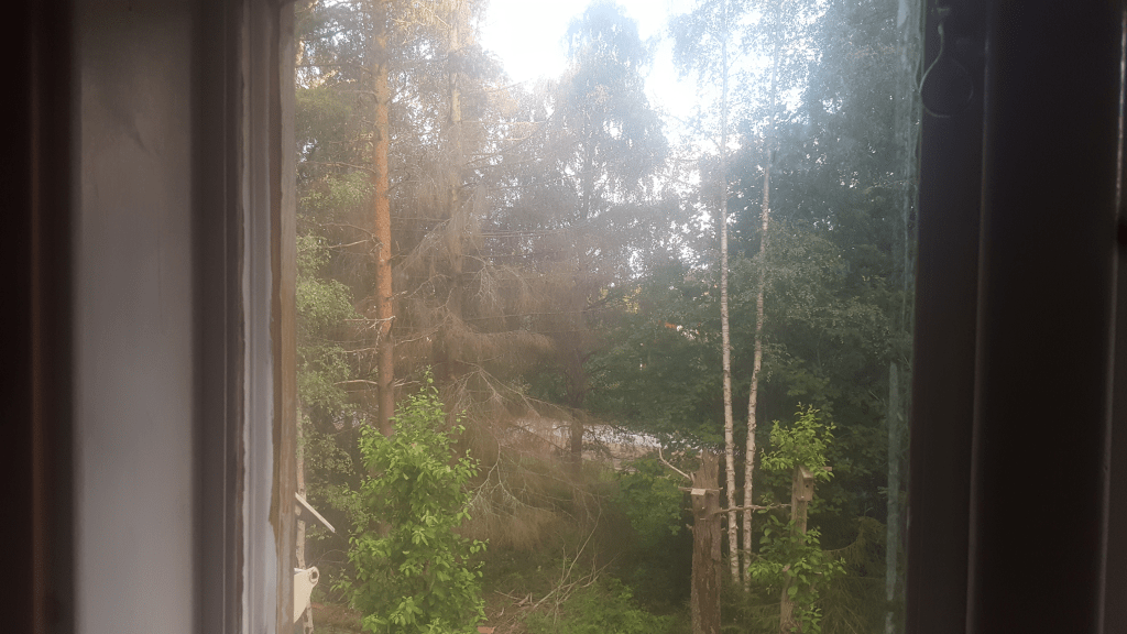 Jag börjar med den första bilden. Men eftersom det är en bild som inte säger så mycket då det är en bild då jag och lillebror satt och tittade på tv så tar jag nästa. Som är en bild från en av de fönsterrutor som fanns där. Av fönsterrutan som var så där avlång som en rektangel så när jag skulle ta kort genom den så kom de andra två fönsterrutorna med eftersom jag inte ville ha med rummet som var för mycket och som dessutom hade en massa skräp i sig. Nej då var det nog bättre om jag tog kort genom det lilla fönstret och därigenom se skogen som fanns där utifrån. Den skogen som tallar, björkar och ett träd som jag inte visste vad det var för något. Men de hade brutits av i mitten så det hade börjat växa ut en massa löv där det fanns möjlighet att växa ut löv. Den här skogen var det enda som skyddade mot det som var den trafikerade vägen. Vilket jag antar att den är än eftersom det är den stora väg som sammanbinder Mora och Malung. Men det jag kunde minnas från den vägen var att den förde så mycket oväsen att jag hade svårt att sova vissa nätter. Skogen hjälpte alltså inte att skydda mot det oväsen som trafiken förde. Vilket väl fick mig att önska att jag bodde på ett annat ställe. Men just då bodde jag ju där och jag har ju varit med om oväsen förut som fått mig svårt att sova. Som det oväsen banden förde när de skapade musik i Brunnsvik. Men i Kättbo var det väl ändå lite annorlunda eftersom det var mitt eget rum. Jag kan komma ihåg att jag hade en säng, det måste ha varit en enkelsäng, ett akvarium på byrån och en massa växter vid just de här fönsterrutorna. Och jag kan komma ihåg att jag såg fram emot att börja skolan. Men det tar vi vid nästa bild…